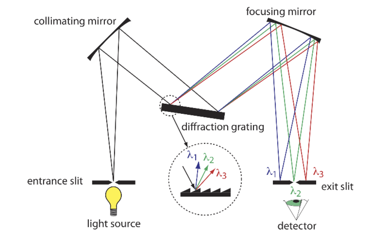 Monochromators are consist of two basic components: the prism and the slit. The prism (diffraction grating in the image) is used to disperse the light into its component wavelengths, while the slit is used to select a specific wavelength of light to pass to the detector. In AAS, the monochromator is used to isolate the specific wavelength of light that corresponds to the element being analyzed. This is where we get to choose which wavelength to use for the measurements.