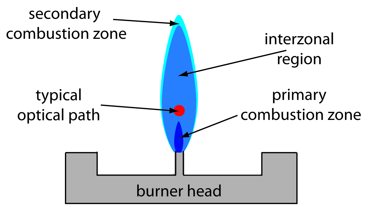 The flame can be demarcated into three zones: the primary combustion zone, the interzonal region, and the secondary combustion zone. The primary combustion zone is where radiation is emitted (not useful for absorption). The interzonal region is where the temperature is more stable and rich is free atoms. This is where we want to make measurements. The secondary combustion zone is where the remaining fuel and oxidant react, but it is generally not ideal for atomization due to potential interference from combustion products. Lower temperature also allows for molecular species, rather than free atoms (Harvey, n.d.).