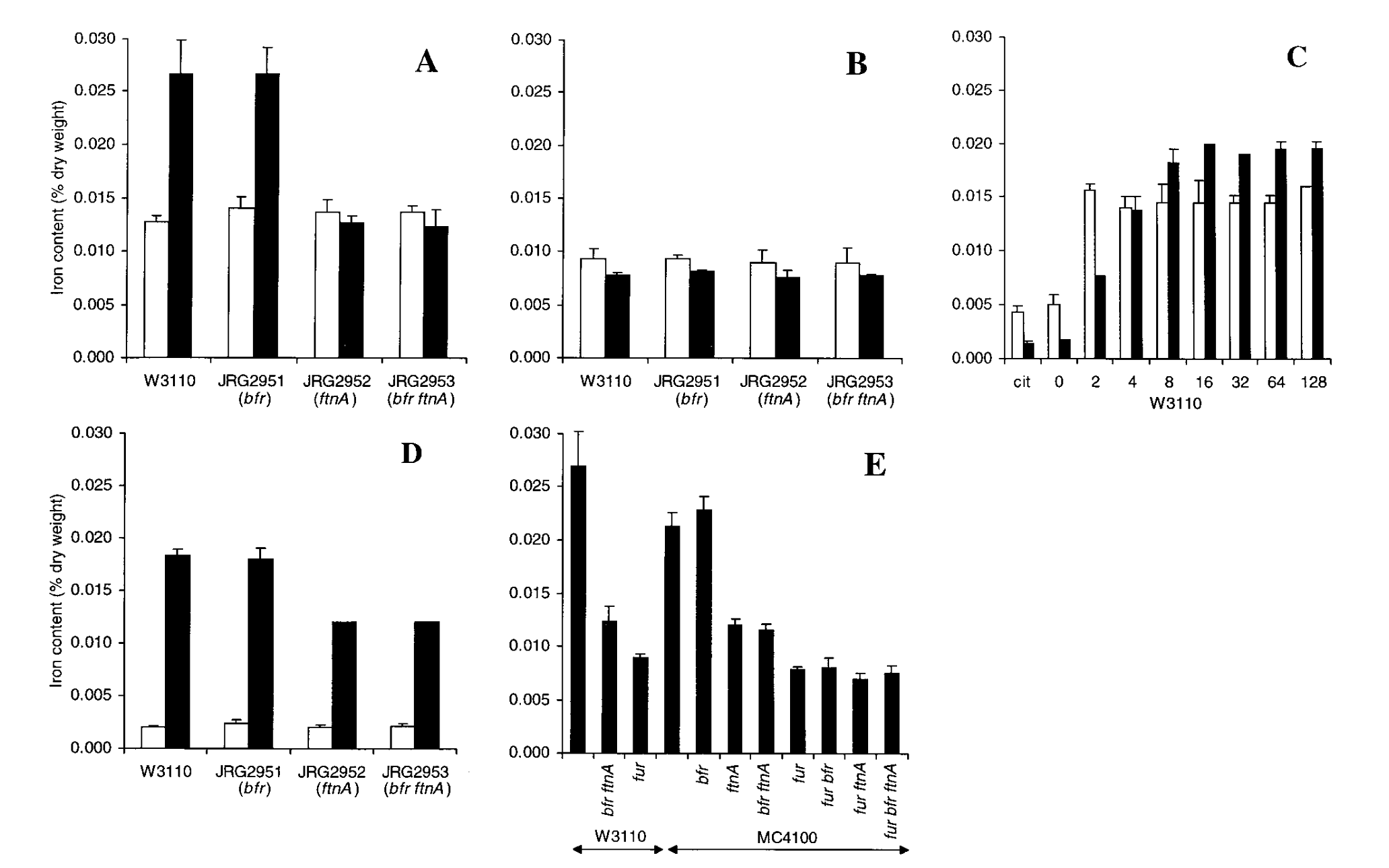 The most important part of the figure is panel E. The x-axis represents the mutant (no label is WT) with W3110 and MC4100 the background strains they decided to use. The y-axis represents the intracellular iron content by % dry-weight. As we can see in the figure, in both strains, the ∆fur has a significantly lower Fe dry-weight % relative to the WT. Hopefully, we will see the opposite trend in the strains that we test…